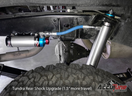 Toyota Tacoma's carrying heavy loads or seeing serious off-road use should use a large diameter 2.5 shock for greater durability and tunability. For the most suspension travel possible, we utilize an OEM fit Tundra rear shock and convert it to fit a Tacoma. When combined with our custom tuning this is as good as it gets for bolt on performance.