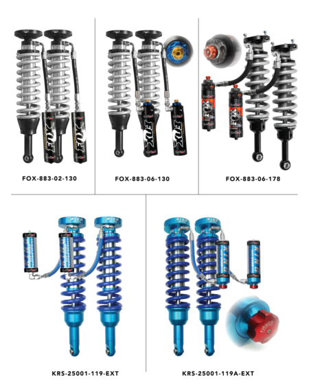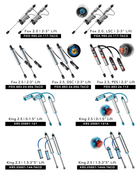 The front of Tacoma's use A-Arms with a large motion ratio so large shocks are required provide off-road capability. Fox or King 2.5 coilovers provide the diameter necessary to make the damping force required to prevent your Tacoma from being too bouncy. The remote reservoirs decrease the operating pressure for a smoother ride and longer life span. The extended travel allows for lift heights up to 2.5" without the suspension over extending. For real off-road performance look no further than a set of custom valved Fox or King Coilovers.