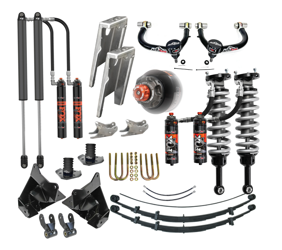 By upgrading the rear shackle hanger and relocating the rear shock we are able to get 12" of travel out of a spring over Tacoma. The Archive Garage Shock Relocation bracket has more ground clearance and is easier to install than other kits. The Ride Shocks Shackle Hanger Kit with 4" long shackles eliminate bushing bind and allow the springs to achieve their full potential (cross bar sold separately). If you want the ultimate mid travel setup look no further than this combination.