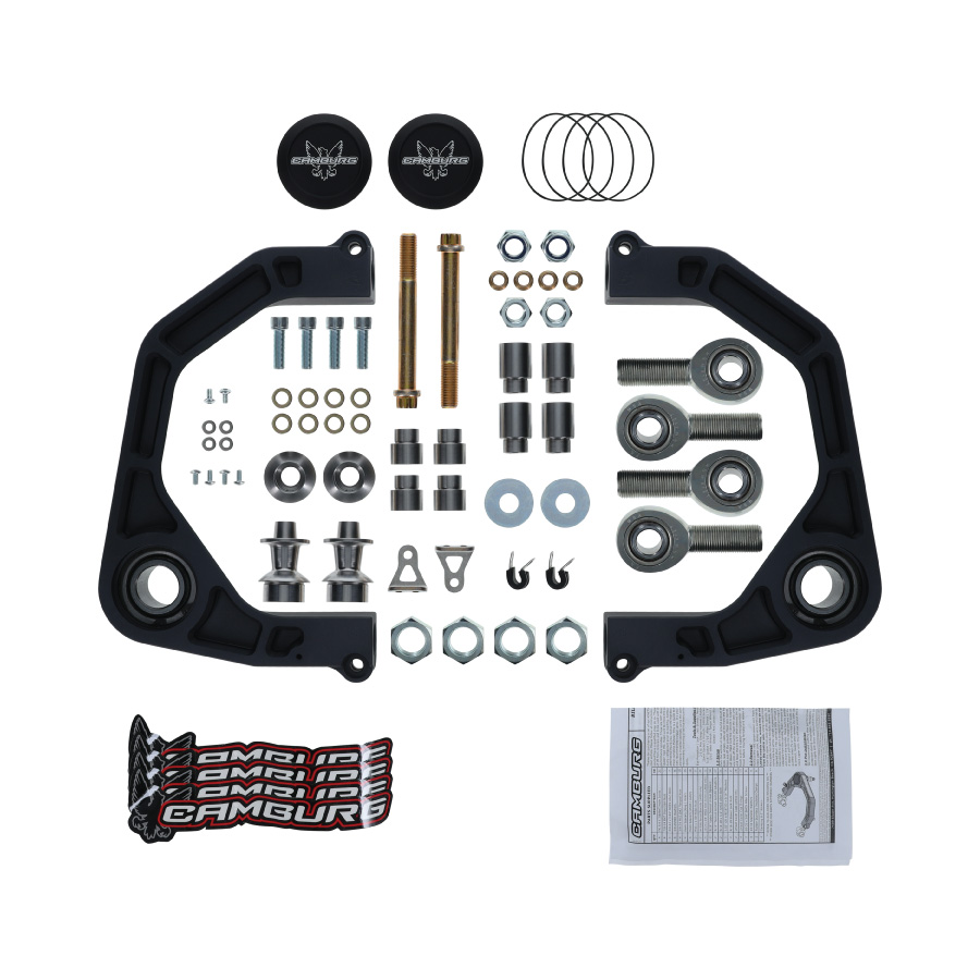 These arms are meticulously designed and crafted using CAD and CNC machining. They are made from aerospace quality 6061 billet aluminum and undergo bead blasting, Type II anodizing, and laser etching for a sleek gun metal gray finish with our Camburg logo. The larger FK 1.25″ uniball with a PTFE liner provides increased strength and mis-alignment for maximum wheel travel. The arms are made in the USA and are superior to cheaper imports. Model specific spacers machined from heat-treated stainless steel adapt the uniball to the spindle/knuckle without drilling or modifications. The 1.25″ uniball allows for a larger bolt with a low profile press-on cap to resist the elements. The use of FK 7/8″ chromoly heim joints allows for additional camber and caster adjustment while eliminating flexing/deflection and binding. AN/Mil-spec hardware, including a single pinch bolt and secondary jam nut, ensures secure heim joint performance in off-road conditions. The new V2 design increases usable wheel travel, corrects camber and caster, and eliminates weak factory ball-joints. All necessary hardware is included for installation. These arms are designed for 1-3″ of lift.