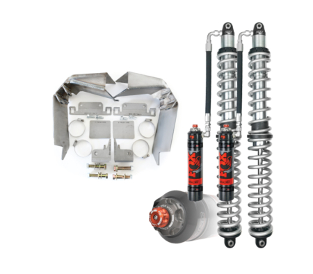 This kit will allow your Jeep JK to run 2.0 x 14″ travel Fox or King coilovers with 5″ of up travel on 3.5″ of rear lift and 3.5″ bump stop spacers. This setup provides substantially more droop than lift kits and bolt on aftermarket parts can support. Recommended only for experts using aftermarket axles and custom suspension geometry. May require exhaust and skid plate modifications.